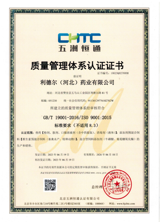 2016年投資建設(shè)的微生態(tài)混合型飼料添加劑車間、添加劑預(yù)混合飼料車間、中藥發(fā)酵車間已順利通過驗收并投入使用,并于2016年全廠區(qū)順利通過ISO9001質(zhì)量管理體系認(rèn)證。2018年9月份順利通過ISO14001環(huán)境體系認(rèn)證。目前已發(fā)展為集動物藥品、動物保健品、飼料、飼料添加劑、預(yù)混劑的研發(fā)、生產(chǎn)、銷售、服務(wù)、肉雞養(yǎng)殖、外貿(mào)出口為一體的綜合性現(xiàn)代化公司。