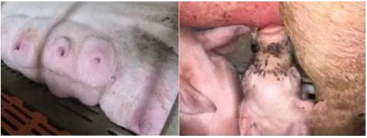 當(dāng)夏季環(huán)境溫度較高時(shí),母豬體內(nèi)溫度較高,血液主要供給皮膚毛細(xì)血管進(jìn)行散熱,而進(jìn)入乳房的血流量減少,營養(yǎng)供給減少,從而導(dǎo)致產(chǎn)奶量降低。產(chǎn)奶量降低表現(xiàn)為:母豬乳房周圍有明顯的黑圈,仔豬額頭有黑色污漬。如下圖