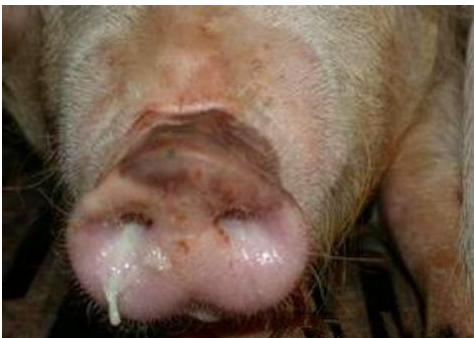 臨床癥狀:(1)豬群表現(xiàn)突然發(fā)病或表現(xiàn)開始數(shù)個豬只不吃料,2-3后天全群基本感染,群體采食量下降30%-60%不等;(2)感染對象均是保育仔豬或中豬、大豬,一般是從中豬、大豬開始發(fā)病,逐漸漫延到保育仔豬;(3)病豬可見打噴涕,流清鼻涕或膿性鼻涕,咳嗽、呼吸急促,腹式呼吸明顯,特別是在臥睡的時候