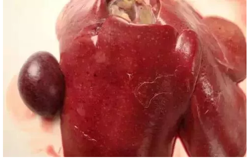 壞死性腸炎蛋雞肝臟布滿針尖大小的黃白色壞死灶,脾臟點狀出血、腫大