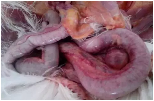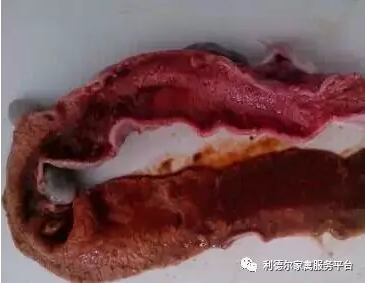 病變主要在小腸,尤其是空腸和回腸部分;小腸顯著腫粗至正常的2~3倍,擴張、充滿氣體;腸壁充血、出血或因附著黃褐色偽膜而肥厚、脆弱。剝?nèi)文た梢娔c粘膜有卡他性炎到壞死性炎的各種變化;腸內(nèi)容物少而呈白色、黃白色或灰白色,有的病例成血色或黑紅色并有惡臭。早期感染病例只能見到回腸、直腸段腸粘膜有米粒大小、似痱子狀壞死灶,這類雞主要怕表現(xiàn)為水瀉。