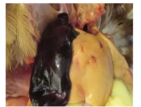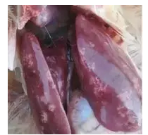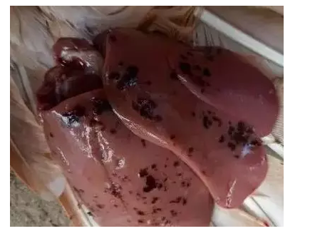 癥狀表現(xiàn):剖檢后發(fā)現(xiàn)一肚子血水、肝破裂,肝腫大、蒼白或呈土黃色,肝表面和實(shí)質(zhì)內(nèi)有黃色、星芒狀的小壞死點(diǎn),布滿菜花樣的壞死區(qū),或者肝被膜下有血腫。防治措施:加強(qiáng)飼養(yǎng)管理,改善雞舍衛(wèi)生條件。飼料中添加肝腎康,連用3-5天。做好飼養(yǎng)管理,加強(qiáng)室內(nèi)帶雞消毒。