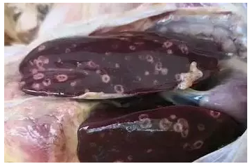 盲腸腫大、腸壁增厚,腸道內(nèi)容物變干,形成干酪樣壞死塊。肝臟腫大,表面有圓形、邊緣隆起、中間凹陷的潰瘍?cè)睢?/span>