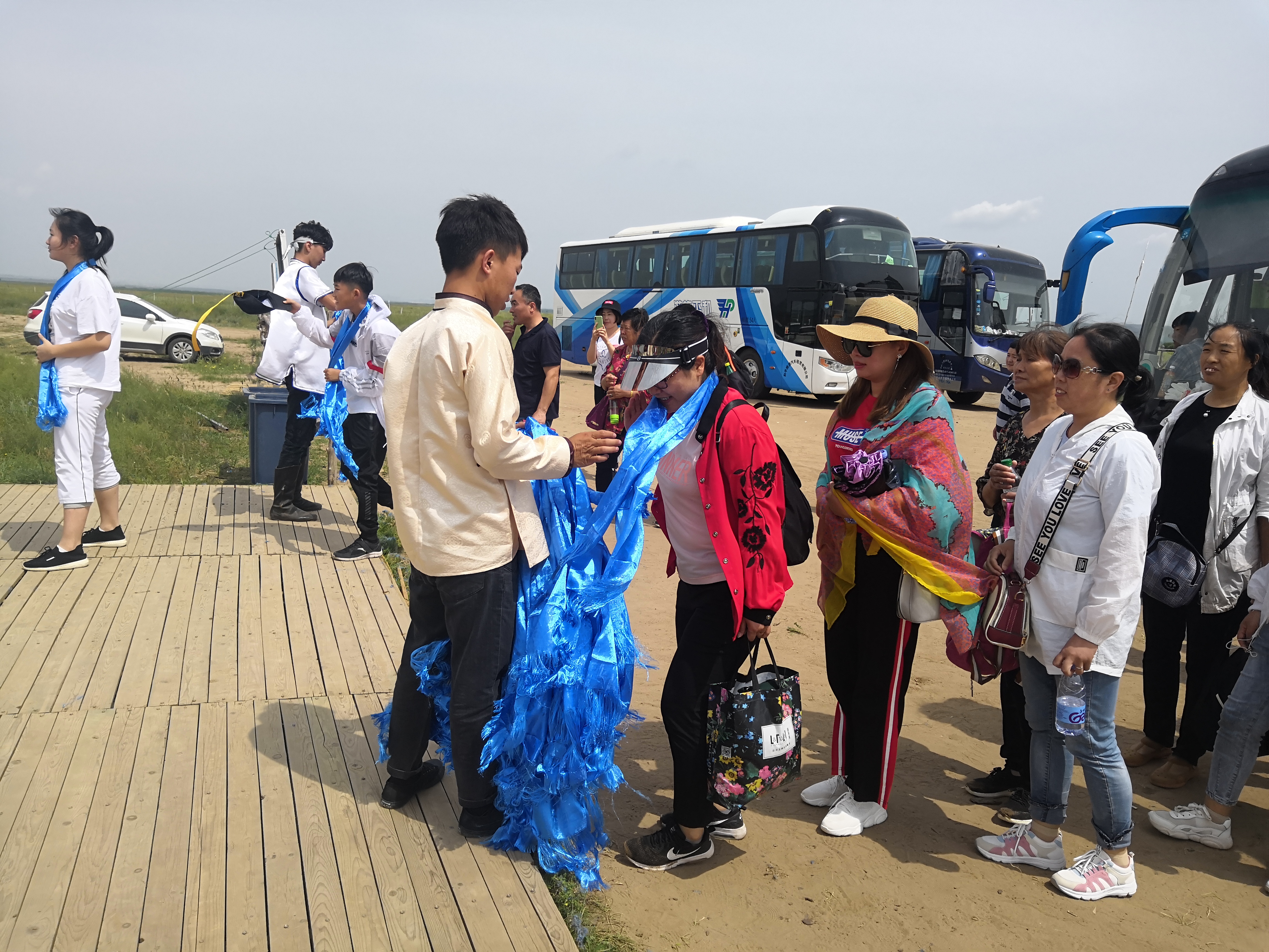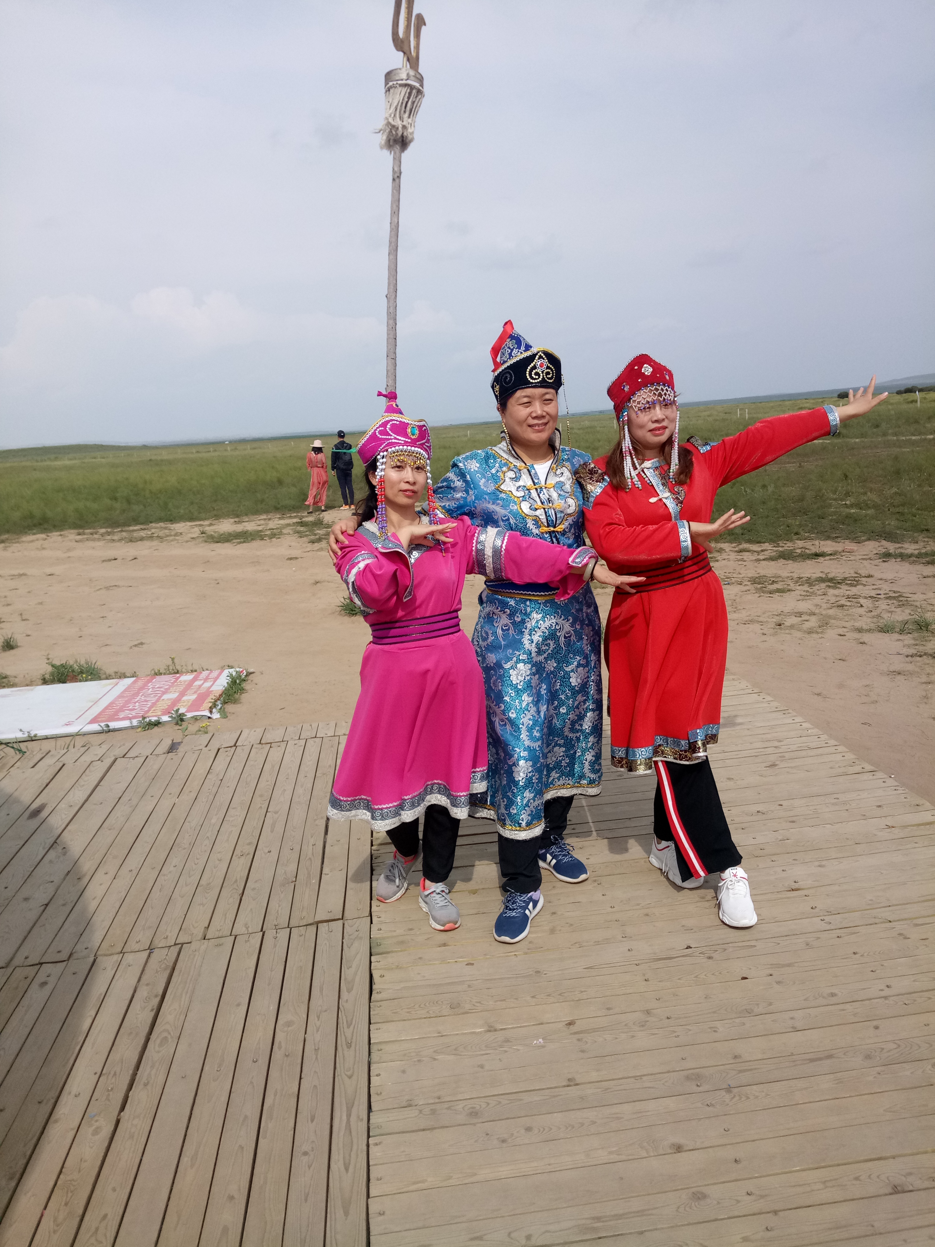 中午抵達(dá)蒙古大營(yíng),途徑忽必烈影視城和梳妝樓,盛裝熱情的草原小伙策馬揚(yáng)鞭,遠(yuǎn)遠(yuǎn)的迎著我們的車過來,為我們接風(fēng)洗塵,獻(xiàn)上哈達(dá)和下馬酒。中午品嘗草原的蝎子骨莜面宴,營(yíng)地里的項(xiàng)目比較多,騎馬的驚魂,摔跤感受蒙古人彪悍,眾人蕩沙橋的刺激,步調(diào)不一致,便會(huì)被掉下橋,射箭,穿蒙古民族服拍照等,感受蒙古的文化氣息。我們來的時(shí)候自備了繩子和大鼓等裝備,拔河比賽,尤其于廠長(zhǎng)老當(dāng)益壯,也不示弱參其中,在呼喊口號(hào)聲中使勁全身力氣,整個(gè)隊(duì)伍,身體向后傾斜。擊鼓傳花,在鼓聲中花兒在每個(gè)人的手中飛舞傳遞,就像一塊燙手的山芋,趕緊的拋給下一個(gè)人,鼓;湔l家,就表演一個(gè)節(jié)目了,好多游客過來圍觀,有的游客也參與進(jìn)來和我們一起進(jìn)行游戲,踩氣球等。晚上觀看名族演出和篝火晚會(huì)。讓您忘記城的喧囂與疲憊,感受草原的廣闊與放縱。