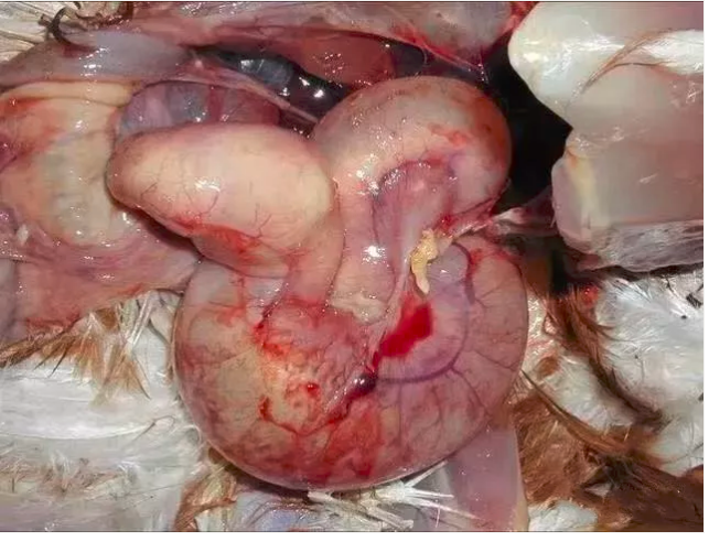 臨床上以輸卵管發(fā)炎為特征,輸卵管內(nèi)經(jīng)常排出黃白色膿樣分泌物,甚至黃白色干酪物,污染肛門周圍和羽毛。這里順帶提一下卵巢炎和腹膜炎,卵泡變形充血和出血,呈紅褐色或灰褐色,甚至破裂,腹腔可見蛋黃液,有臭味,有時(shí)卵泡皺縮,形狀不整齊,顏色為褐色無(wú)光澤,病癥時(shí)間一長(zhǎng),腸道都會(huì)黏連。