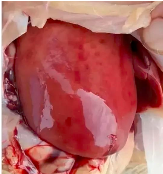 1、點(diǎn)狀壞死:多發(fā)生于肝臟、脾臟,如禽白痢、禽傷寒、禽副傷寒、禽巴氏桿菌病、弧菌性肝炎、壞死性腸炎等疾病時(shí),肝臟或脾臟發(fā)生的點(diǎn)狀壞死,多呈灰白色或灰黃色小點(diǎn)狀或不規(guī)則形狀。