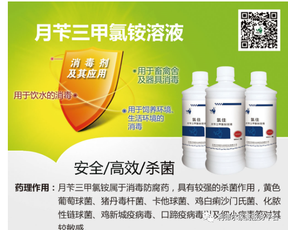 1、氯佳(月芐三甲氯銨溶液),能完全殺滅各種細菌、病毒(有囊膜及無囊膜)、支原體、霉菌、藻類等致病微生物,具有表面活性劑的作用,主要作用于病菌表面。具有沒有刺激性、沒有腐蝕性、無蓄積毒性、滲透性好、維持時間長的優(yōu)勢,適用于舍內外和飲水的消毒。