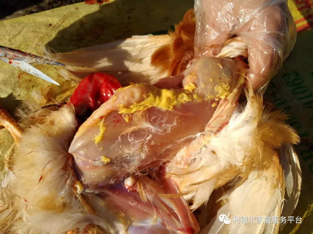 健康雞感染后雞冠呈黃白色,行走困難,跛行,踩高蹺狀,采食減少,體質(zhì)瘦,生長遲緩。剖檢關(guān)節(jié)處有淡黃色膠凍樣粘液,后逐漸變?yōu)檎吵淼狞S白色乳酪樣物。