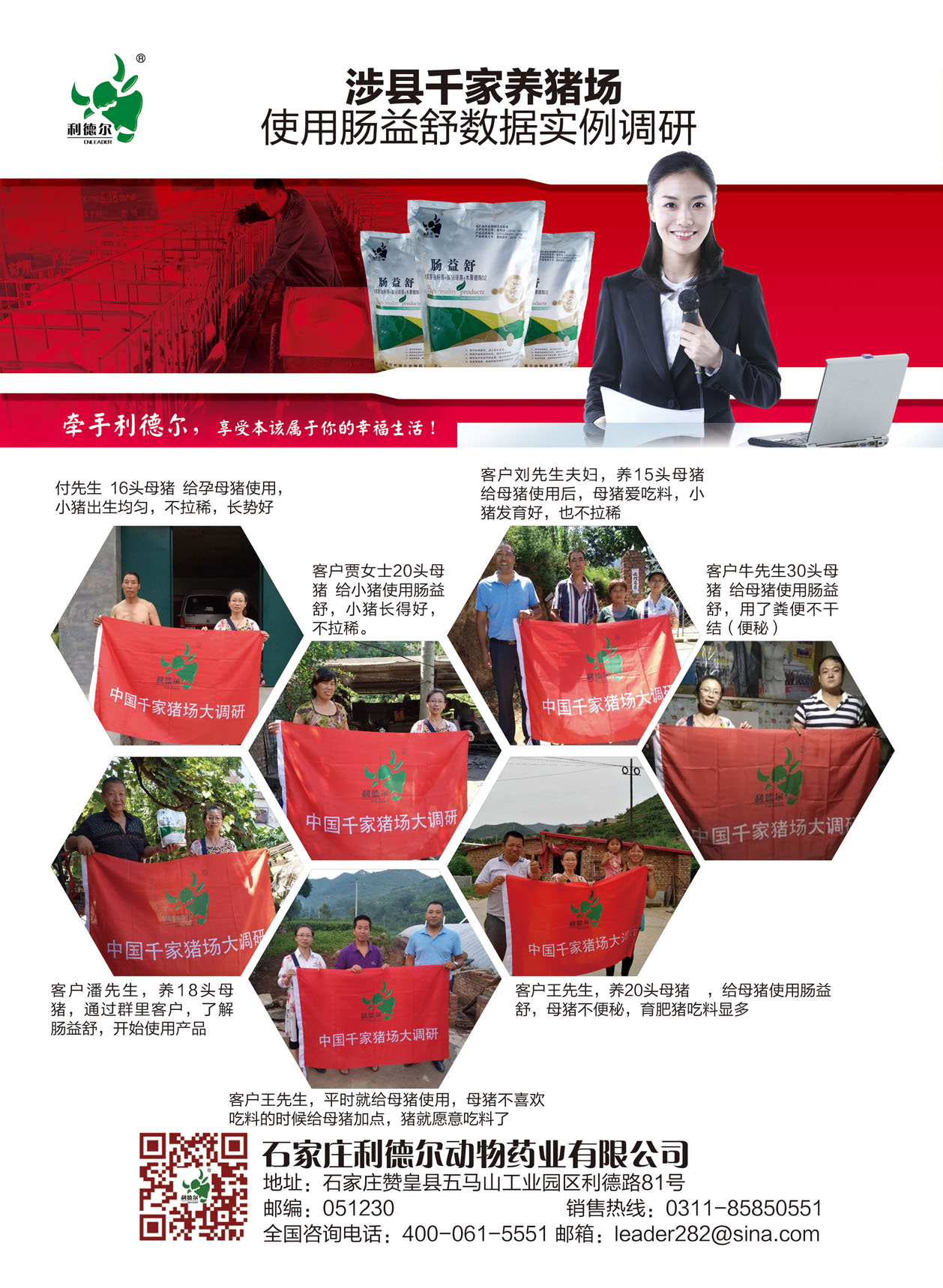 腸益舒投放市場將近半年時間,市場遍布石家莊周邊,唐山、承德,邯鄲,山東、東北,河南,廣東,福建等地,利德爾藥業(yè)本著對客戶負(fù)責(zé),對用戶負(fù)責(zé)的精神!利德爾千家豬場大調(diào)研正在進(jìn)行中,我們已經(jīng)走訪了承德,石家莊周邊和邯鄲部分縣區(qū),雖然今年的養(yǎng)豬行情不如去年,但是養(yǎng)豬戶還是很積極的在擴(kuò)建,怎樣把豬養(yǎng)好。通過市場走訪,養(yǎng)殖戶對公司的腸益舒評價非常高: