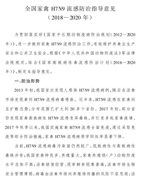 全國家禽H7N9流感防治指導(dǎo)意見(2018—2020年)