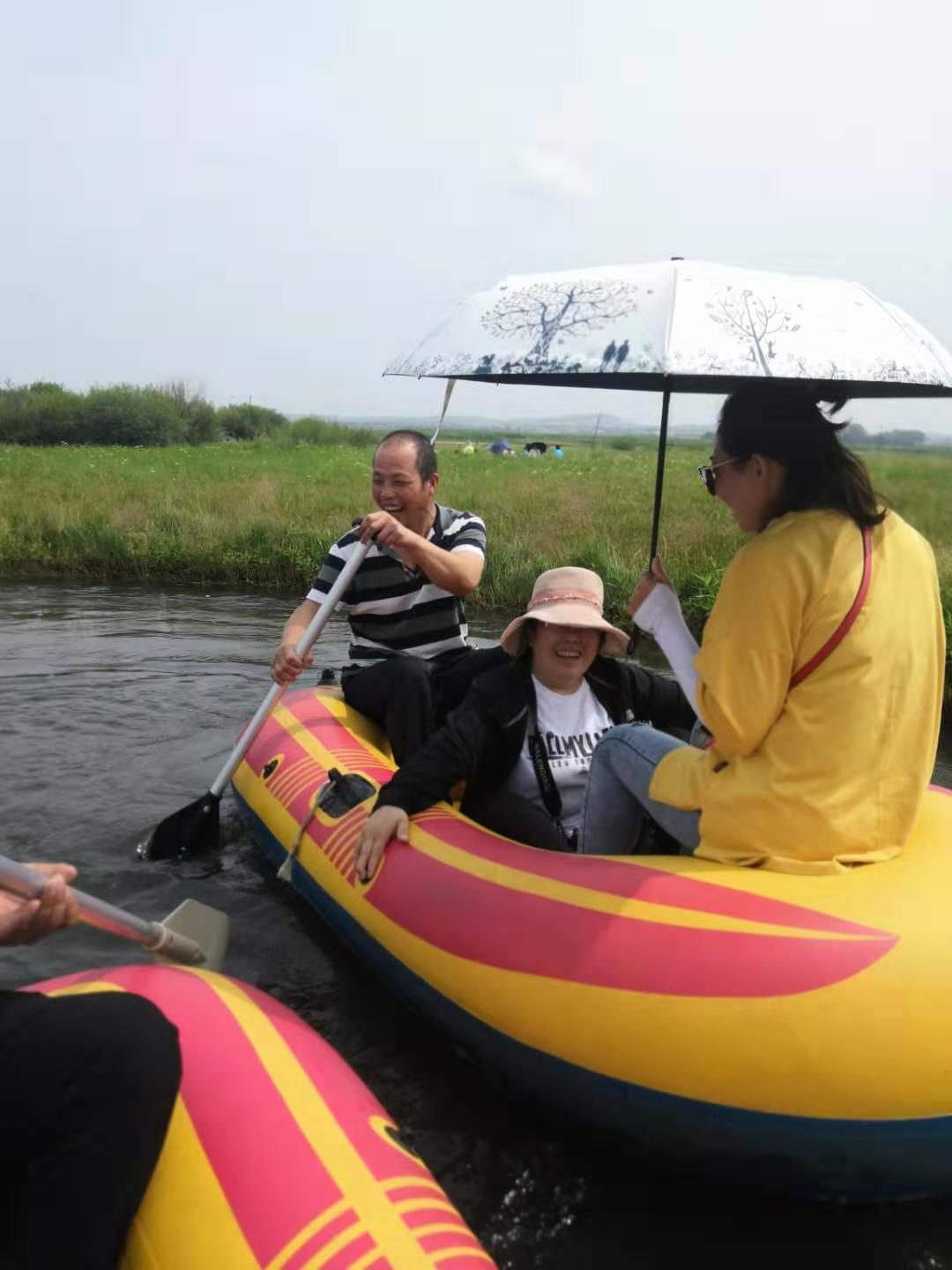 漂流開始,水流很緩,可以瀏覽沿途風(fēng)景,不經(jīng)意間貌似一盆水從天而降,原來是同事的船已靠近,用水偷襲我們,隊(duì)友開始還擊,一場(chǎng)水上作戰(zhàn)就此打開,原來保持矜持的尖叫,到渾身濕透的激烈反擊,一條船,兩條船,多條船,在原地打起了水仗,水花四起,后勤做飯的王姐,平日的老實(shí)人,在這里也揮起了大手掌,快速的從河里撈起水,撒向?qū)Ψ,小姑娘們招架不住,只喊投降,有的干脆跳在水里作?zhàn),尖叫聲,潑水聲,笑聲一片......,有的船只直接打翻,全部隊(duì)友掉落水里,更有船只把另一個(gè)船上的隊(duì)友直接水上劫持,拖到自己的船上去,到達(dá)岸邊,還在戀戰(zhàn),全然不顧濕透的衣服鞋子,如果不親身體驗(yàn),很難感受當(dāng)時(shí)的氣氛。接著是滑沙,坐上越野車,穿越3公里,路過駱馬湖,觀看草原湖泊的獨(dú)特美景,可以看各種稀有水鳥,來到滑沙現(xiàn)場(chǎng),從沙坡上直接滑下的刺激,大人小孩,來回的往返幾次。自由滑落,驚恐中帶著神經(jīng)的刺激,伴著刺耳的尖叫聲,由上而下滑落。