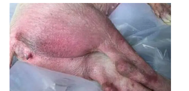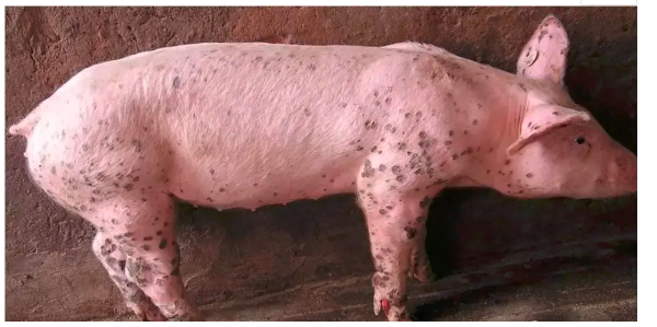 基本不影響吃喝,主要在病豬耳部、背部、腹部、前肢、后腿、臀部等部位廣泛性出現(xiàn)各種大小不一的紅斑、斑點(diǎn)、丘疹,圓形或不規(guī)則的隆起,呈現(xiàn)紅色或紫色,中央為黑色的病灶,持續(xù)時間長,指壓不褪色。保育豬和生長豬多發(fā),病豬可見腹股溝淋巴結(jié)明顯腫大。